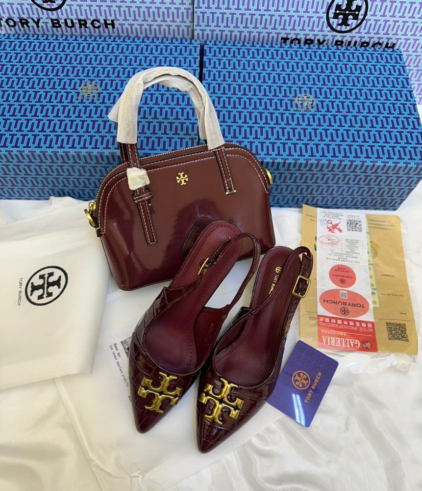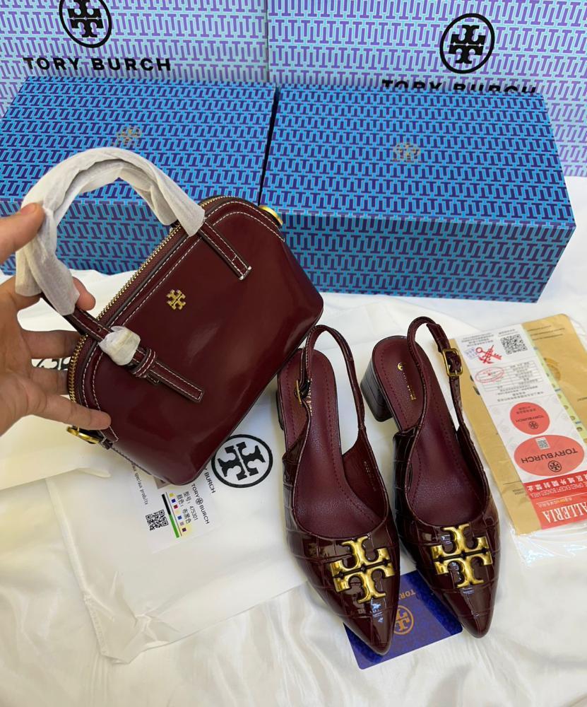 طقم توري بورش هو عنوان الأناقة العصرية، الطقم مكون من شنطة وهيلز مميز، متوفر بلون برغندي جذاب، ويزدان بشعار Tory Burch المعروف ليمنحك لمسة فاخرة في كل مناسبة.